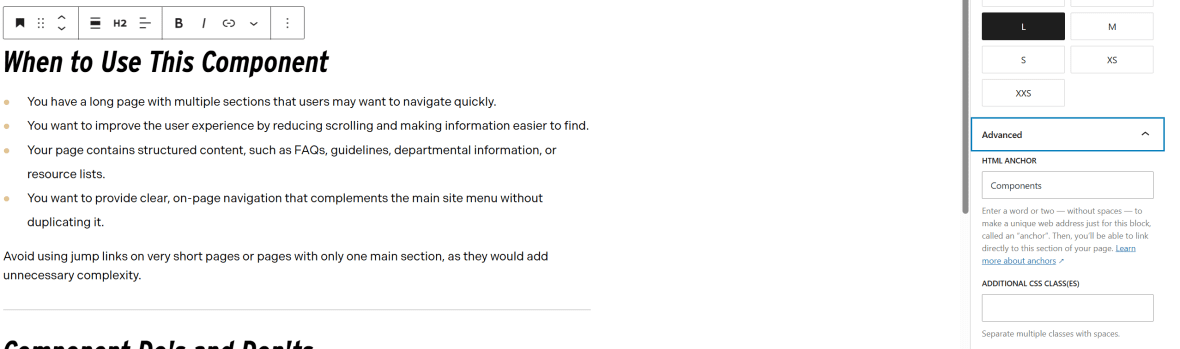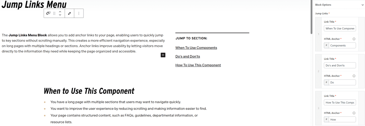 There might be a time when you don’t know whether to use a Jump Link Menu component or not. Here are some examples of how to effectively use a Jump Link Menu component and when you shouldn’t use one:
