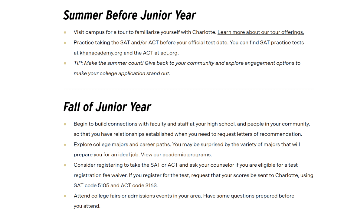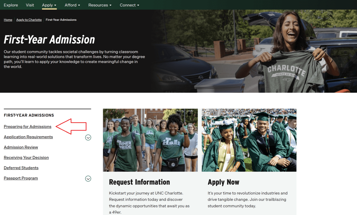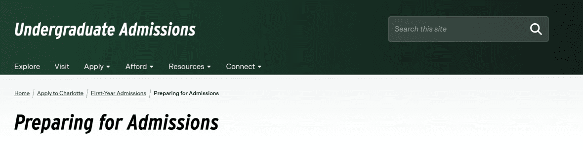 In this guide, we will use the Preparing for Admissions page on the UNC Charlotte Undergraduate Admissions website as a model for best practices in building a Content Page. Specifically, we will reference this page as an example of strong structure, clarity, and user-focused design.
