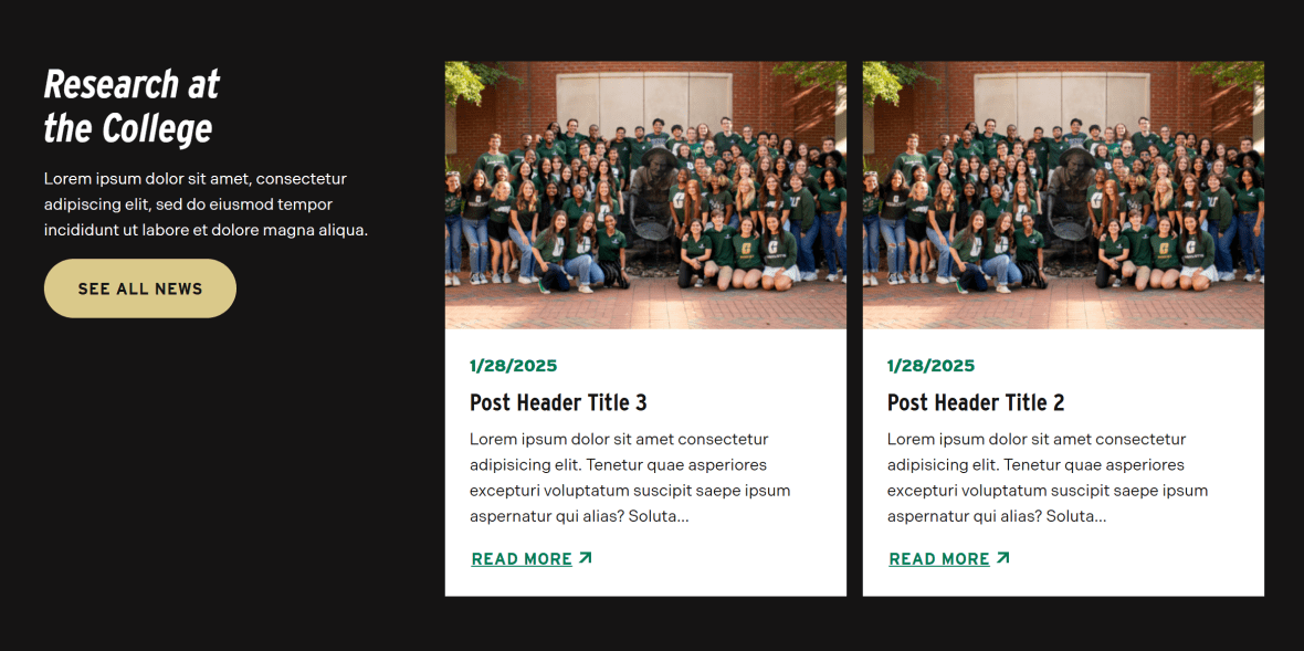 On a primary landing page, this component plays an important role in demonstrating activity and momentum. Fresh content signals that your department or program is engaged, current, and actively contributing to the university community.