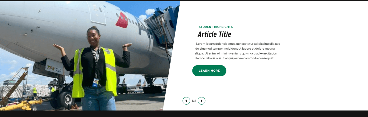 On the example primary landing page, the Slider Block is used to highlight Student Success stories and related articles. This approach keeps the section visually engaging while reinforcing the college’s impact through narrative-driven content.